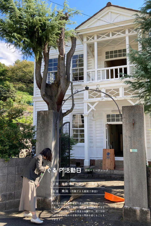 築110年の洋館「海友舎」をみんなで掃除することで、建物に興味と愛着を持っていただくことが目的です。掃除の後にはお茶を飲みながら、みんなでいろんな話をしましょう。海友舎とぐるPに興味がある方なら、どなたでも参加できます。ぐるぐると活動していきましょう!